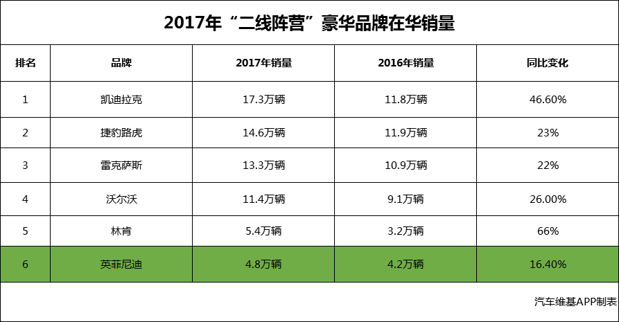 纵观英菲尼迪在国内汽车市场的表现,不得不说,目前英菲尼迪颓废之势已非常明显。入华11年,国产3年,其销量成绩却是豪华品牌中垫底的那一个。据了解,英菲尼迪2017年销量仅4.8万辆,而对手凯迪拉克、捷豹路虎、雷克萨斯、沃尔沃齐刷刷地跨进了“10万+俱乐部”。二线豪华品牌中,英菲尼迪同比增长速度也是最慢的,仅16.4%,可以说是“龟速”增长。