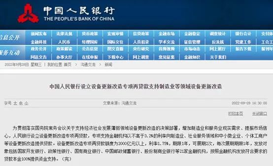 设立设备更新改造专项再贷款,央行:支持10个领域,额度在2000亿元以上,利率1.75%!